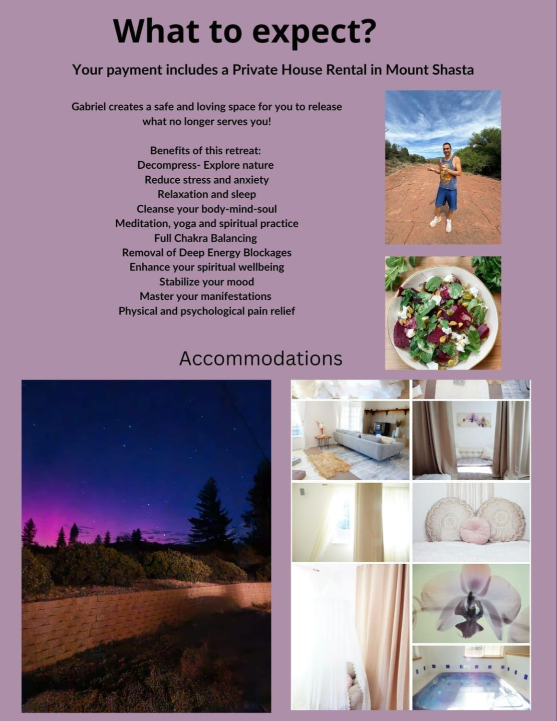 Price includes lodging and the Gabriel’s healing services. Like deep meditation in nature connection with the healing elements on the mountain and intuitive coaching.
